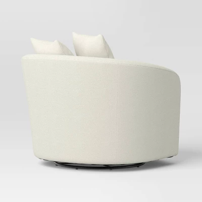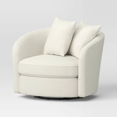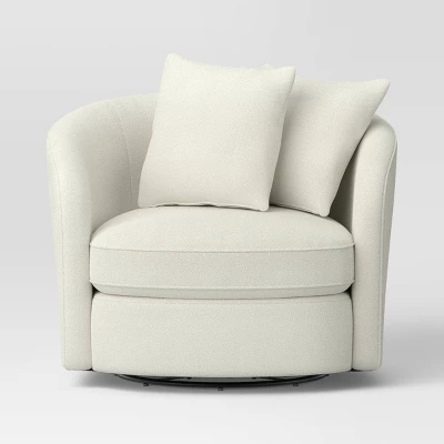 Elevate your indoor seating with this Oversized Upholstered Swivel Accent Chair with Pillows from Threshold™. Dressed in cream-color boucle upholstery, this barrel-silhouette accent chair has a cushioned seat and back along with two comfy pillows to provide you a comfortable seating experience. It also boasts a swivel base that offers effortless movement around any space.