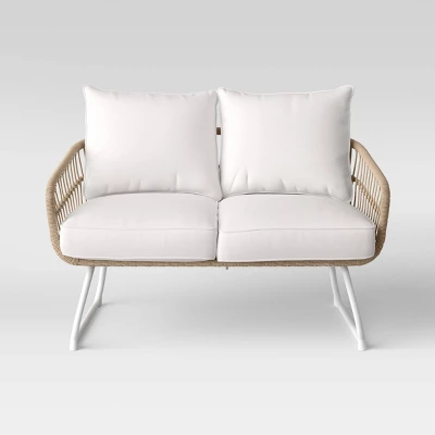 Relax on the patio with a good book, movie or chat with a friend with the Southport Patio Loveseat from Threshold™. This charming loveseat features a white steel frame paired with beige wicker details for a look that’s equal parts chic and bold. The neutral colors match well with any design aesthetic you may have going on in your patio space, whether you prefer more rustic and cozy decor or an aesthetic that feels cool and streamlined. The rust- and weather-resistant properties mean worry-free maintenance and the seat and back cushions provide comfort and coziness.