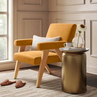Rest in comfort and luxurious style with the Textured Woven Upholstered Arm Accent Chair from Threshold™. This accent chair stands on four wooden legs that complement the upholstered arms and seats for an elegant look. Place it in your living area or any other area to enjoy your favorite cup of tea alone or a chit-chat with loved ones.